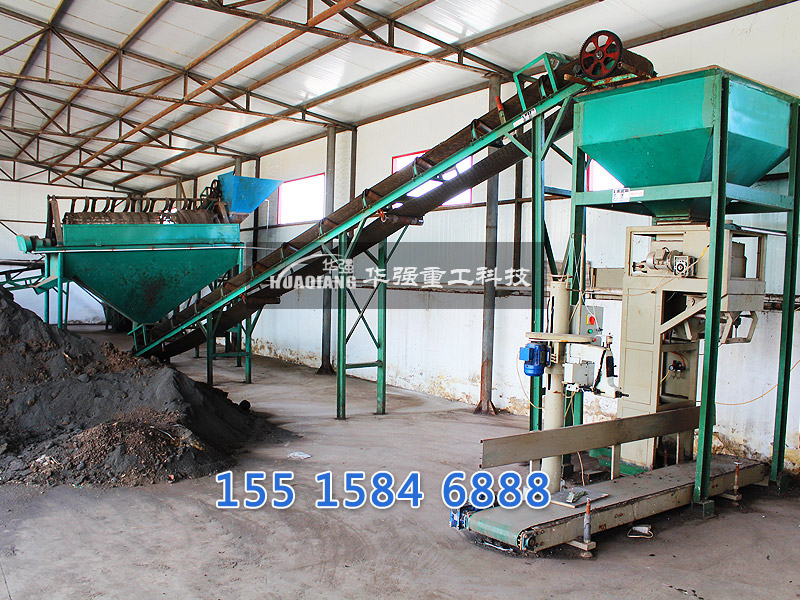 進(jìn)一步對(duì)堆肥成品進(jìn)行篩分,篩下物根據(jù)水分含量高低分別進(jìn)行處理。篩下物造粒后,送入由沼氣池沼氣供熱的烘干機(jī),進(jìn)行烘干,按比例添加中微量元素后攪拌混合后制成成品,進(jìn)行分裝,入庫(kù)待售。篩上物返回粉碎工序進(jìn)行回用。