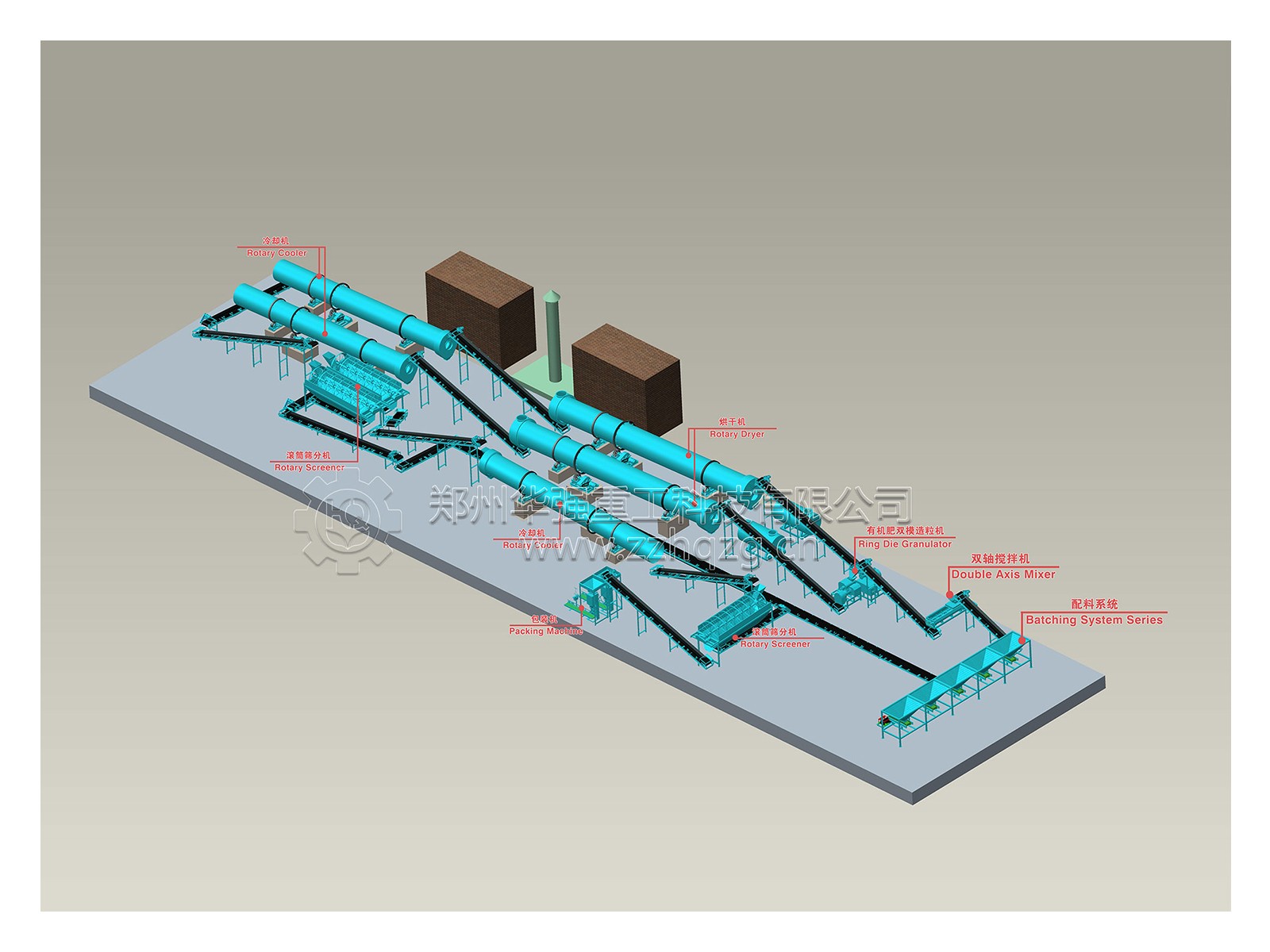 生物有機(jī)肥生產(chǎn)線用于生物肥料的生產(chǎn),以有機(jī)質(zhì)為主,纖維素多、成形條件差,并添加有造肥功能的活細(xì)菌群、生產(chǎn)過程以不宜接觸高溫等特點(diǎn)。造料方式上采用園盤造粒、擠壓和新型造粒方法,因?yàn)檫@三種工藝,要求原料的粉碎細(xì)度高,造粒水分高,一般含水量要達(dá)到30%左右,成開后顆粒含水量低,烘干的負(fù)荷很小,可以減少有效細(xì)菌的損失,粉塵小,操作環(huán)境較好。原料進(jìn)入造粒機(jī)中,加入適量的水或蒸汽、粘結(jié)成粒,造粒后物料通過皮帶機(jī)送入烘干機(jī)進(jìn)行干燥。顆粒直徑為3.0-4.0mm,成粒率大于70%。生物肥料的生產(chǎn)過程中,不僅成形后顆粒含水量一般都要超過指標(biāo),需要低溫烘干,而且有機(jī)質(zhì)原料經(jīng)發(fā)酵后,含水量約為30%~40%,成粒后顆粒水份一般在15%~20%之間,肥料質(zhì)量指標(biāo)要求含水量低于14%,需進(jìn)行烘干處理。因此干燥工段是生物肥料生產(chǎn)過程中不可缺少的重要工序,直接影響產(chǎn)量、質(zhì)量和能耗,合理選擇干燥機(jī)的型號規(guī)格,控制的工藝條件是非常重要的。在烘干機(jī)前部設(shè)有一段二次造粒區(qū),物料在此區(qū)間可實(shí)現(xiàn)二次造粒。然后經(jīng)揚(yáng)料板將物料揚(yáng)起實(shí)行充分干燥,烘干機(jī)尾部通過抽風(fēng)機(jī)經(jīng)管道將濕潤的熱空氣抽出,進(jìn)入沉降室沉降,尾氣在通過沉降后經(jīng)過洗滌塔實(shí)行噴淋降塵,噴淋水由水泵抽出循環(huán)使用,經(jīng)過二次降塵處理后,符合國家標(biāo)準(zhǔn)的尾氣經(jīng)煙囪排入大氣。